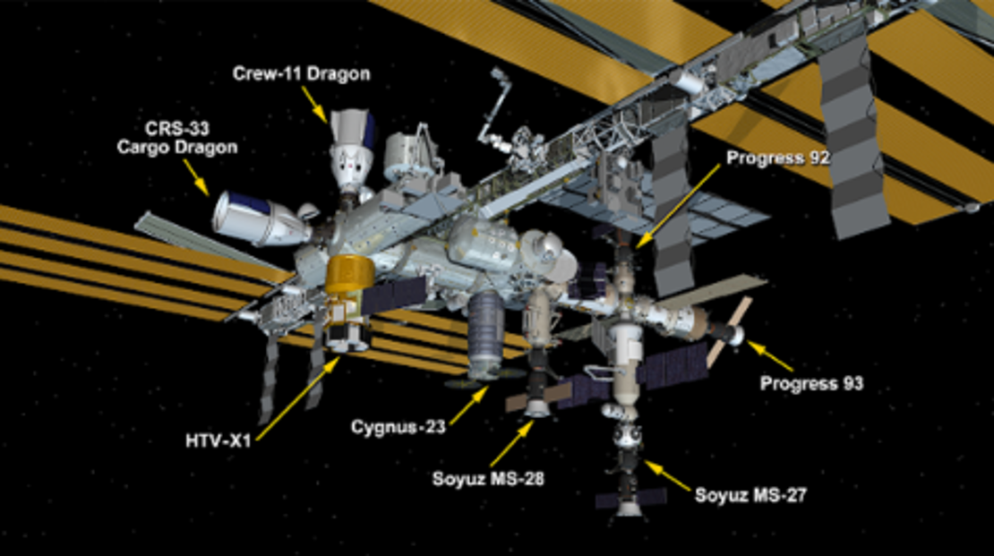 12월 3일 기준 ISS에는 미국의 유인 우주선 'Crew-11 Dragon'(스페이스X 제작), 무인 화물선 'CRS-33 Cargo Dragon'(스페이스X 제작), 일본의 무인 화물선 'HTV-X1'(미쓰비시중공업 제작), 무인 화물선 'Cygnus-23'(노스럽 그러먼 제작), 러시아의 유인 우주선 'Soyuz MS-28'과 'Soyuz MS-27, 러시아의 무인 화물선 'Progress 92'와 'Progress 93'이 도킹해 있다. |