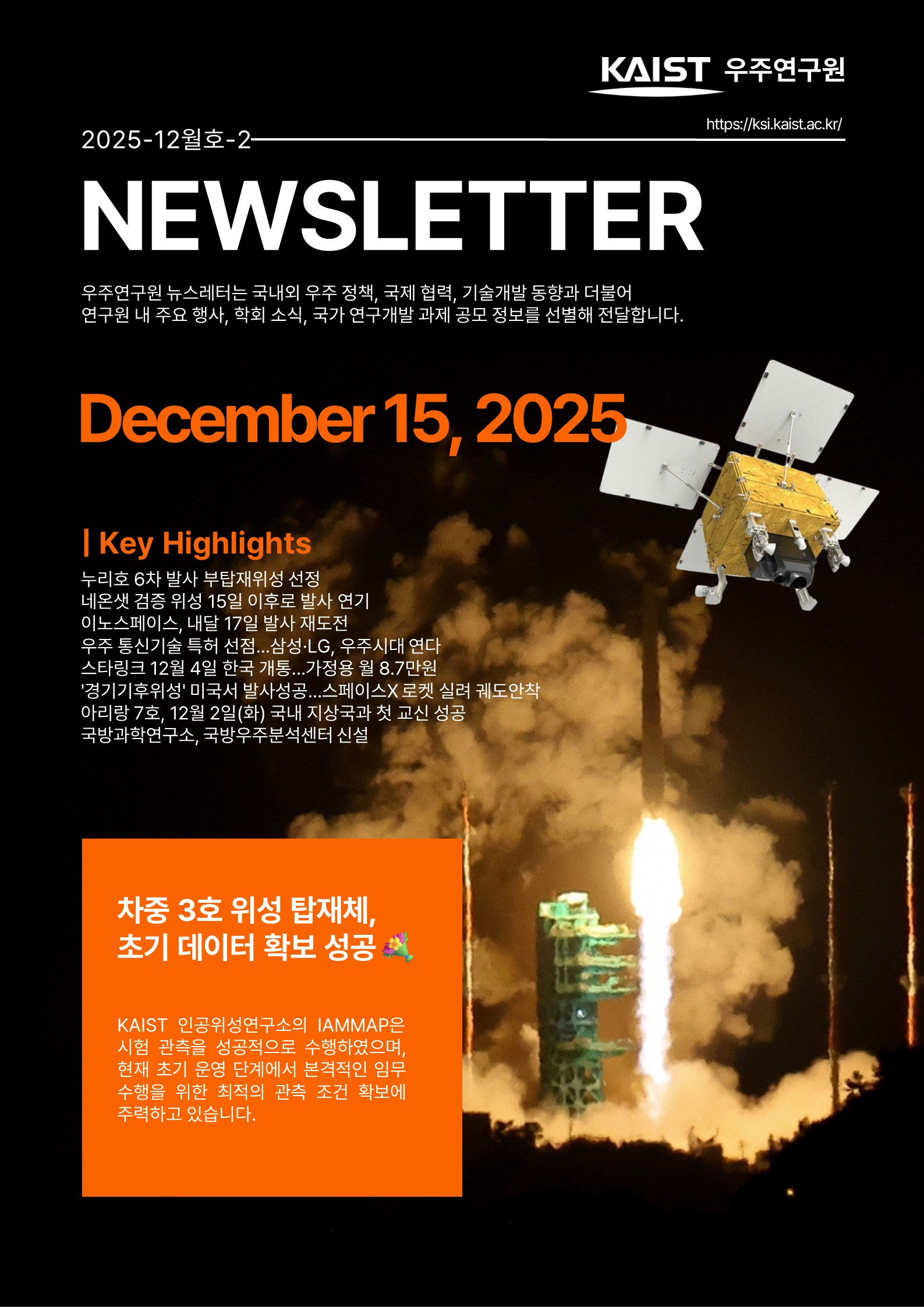 우주연구원 뉴스레터는 국내외 우주 정책, 국제 협력, 기술개발 동향과 더불어 연구원 내 주요 행사, KAIST 우주연구원은 2주 간격으로 국내외 우주 정책, 국제협력, 기술개발 동향과 더불어 연구원 주요 행사, 학회 소식, 국가 R&D 공모 정보를 선별하여 제공해 드립니다. 계속해서 뉴스레터를 받아보시려면 아래 ‘구독하기’ 버튼을 눌러 이메일 주소를 입력해 주십시오. |