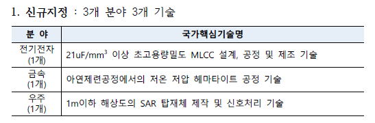 한국 산업통상부가 전기전자금속우주 기술을 국가핵심기술에 새롭게 지정한다고 10 월 1일 밝혔다. 이러한 내용의 '국가핵심기술 지정 등에 관한 고시' 개정안은 2일부터 시행됐다.